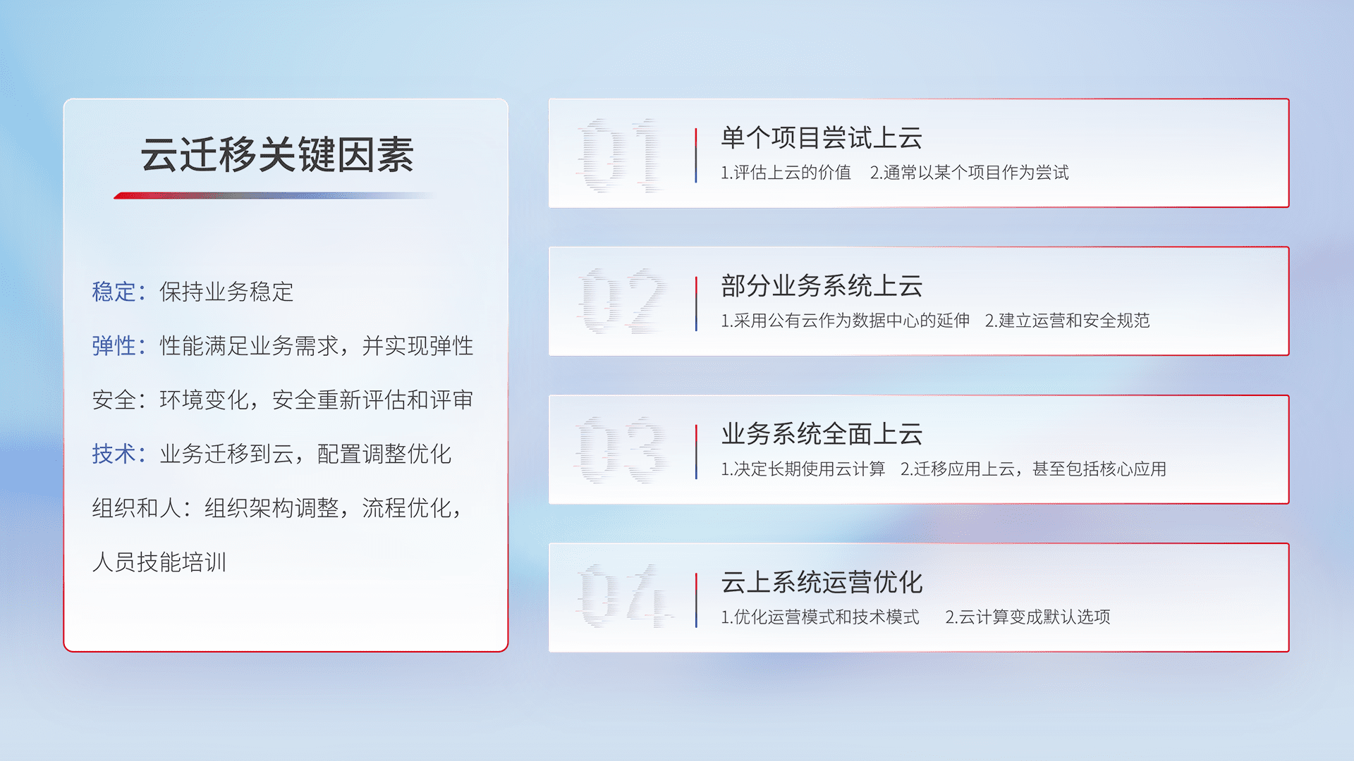 结合实际业务,,,从规划设计、、云平台选型、、云原生改造、、、数据迁移、、集成交付,,,迁移全过程为客户识别最佳上云路径,,,,做好风险识别管理,,设计网络架构、、、身份权限、、、、安全审计合规、、、、操作审计、、日志审计、、、监控告警策略、、、多站点容灾设计等,,,,对云上基础设施进行整体规划,,提升IT治理水平,,,以满足弹性、、、高可用、、、、高性能的需求。。。