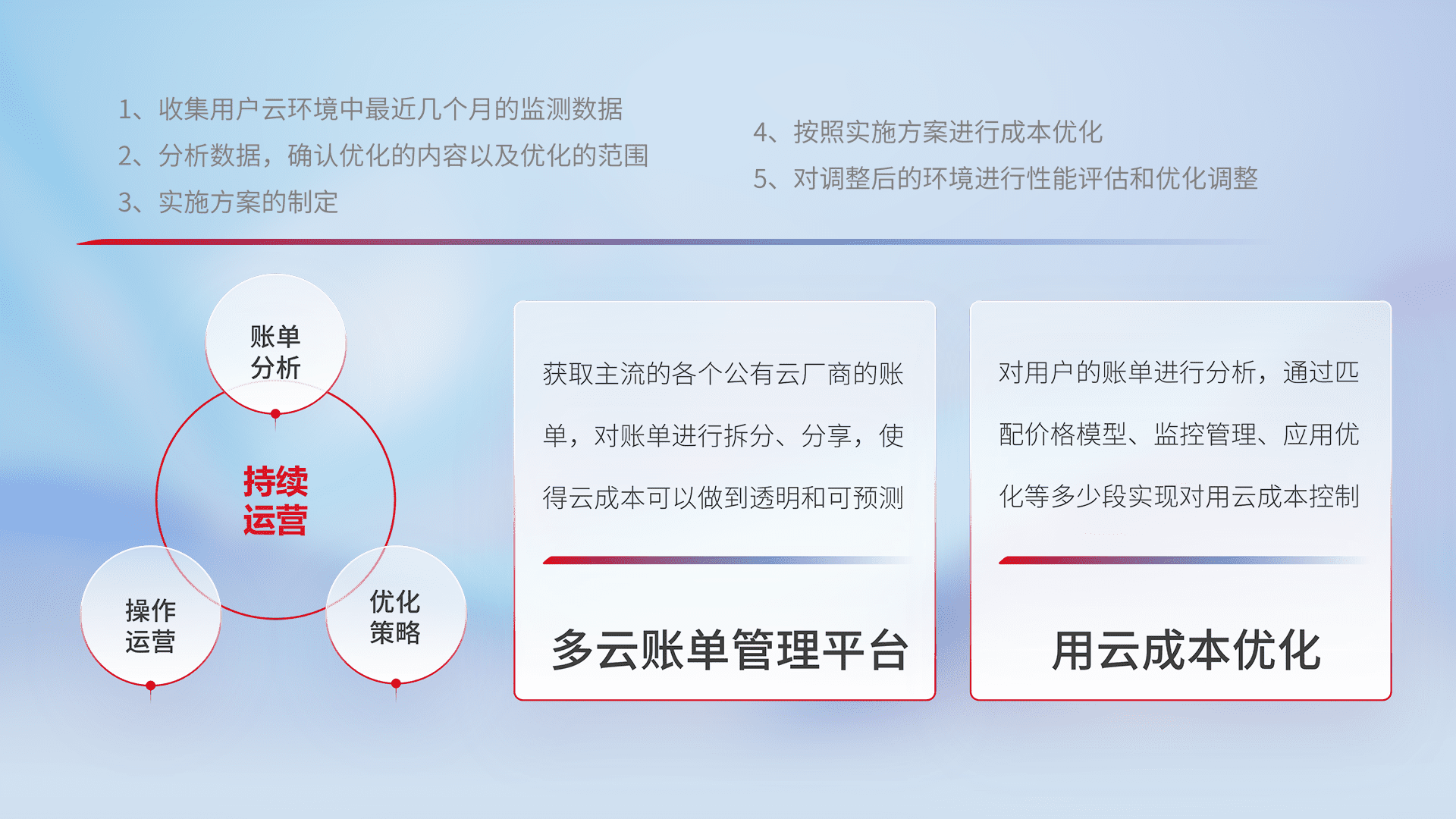 通过多云纳管,,,以统一的资源数据模型把客户的云资源进行抽象和封装,,,,进而实现对多云资源的统一操作,,保障云资源管理的可靠性、、稳定性与可用性。。量身定制化运维内容,,配置、、开发运维、、、、补丁管理、、备份、、、、监控、、认证和访问管理、、、审计和日常巡检等,,,,保障在用云过程中的可靠度,,,,稳定度以及高可用率。。。。
