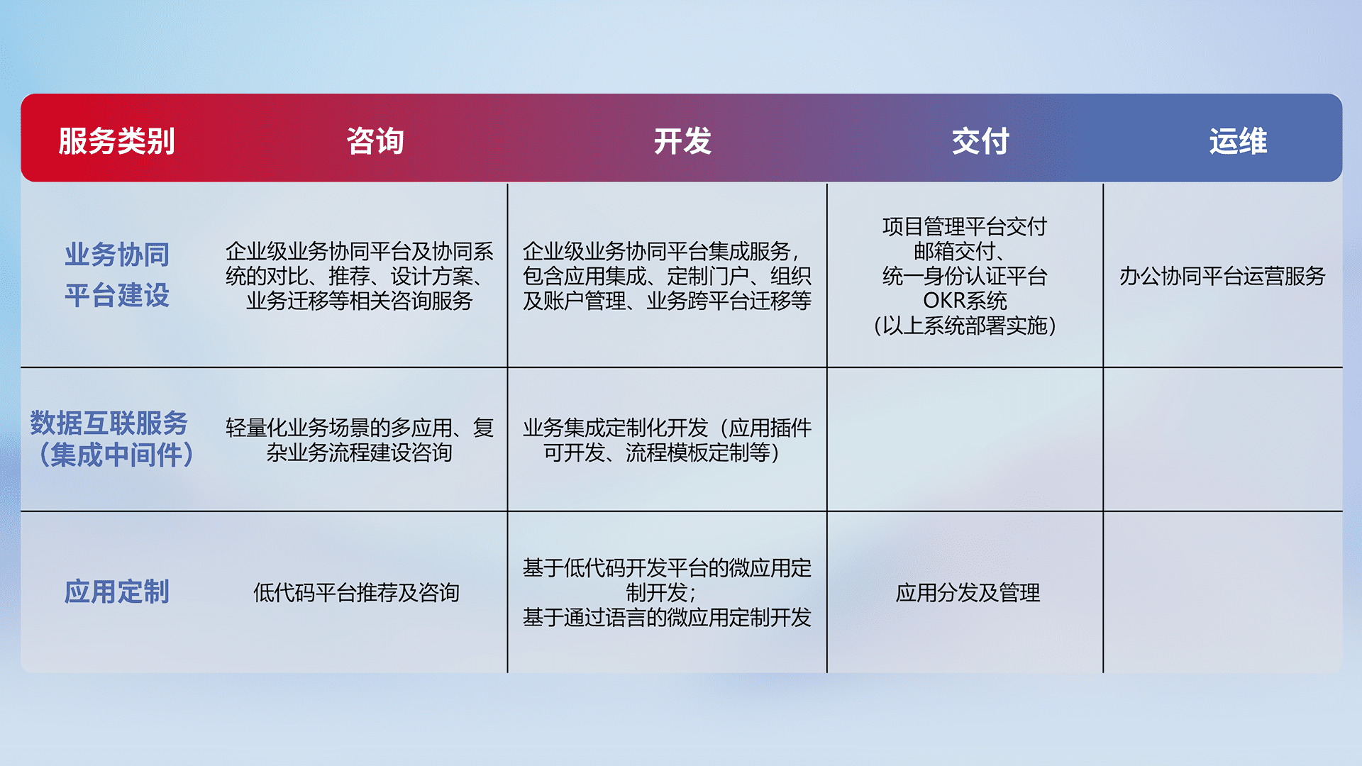 针对钉钉、、、企微、、IDaas等平台级产品提供产品的规划、、、方案、、、、交付、、、定制化开发等服务,,,,实现如统一协同办公、、、智能客户服务、、混合会议管理、、、、智能数据查询、、、、等业务场景,,,实现数字化转型。。。。