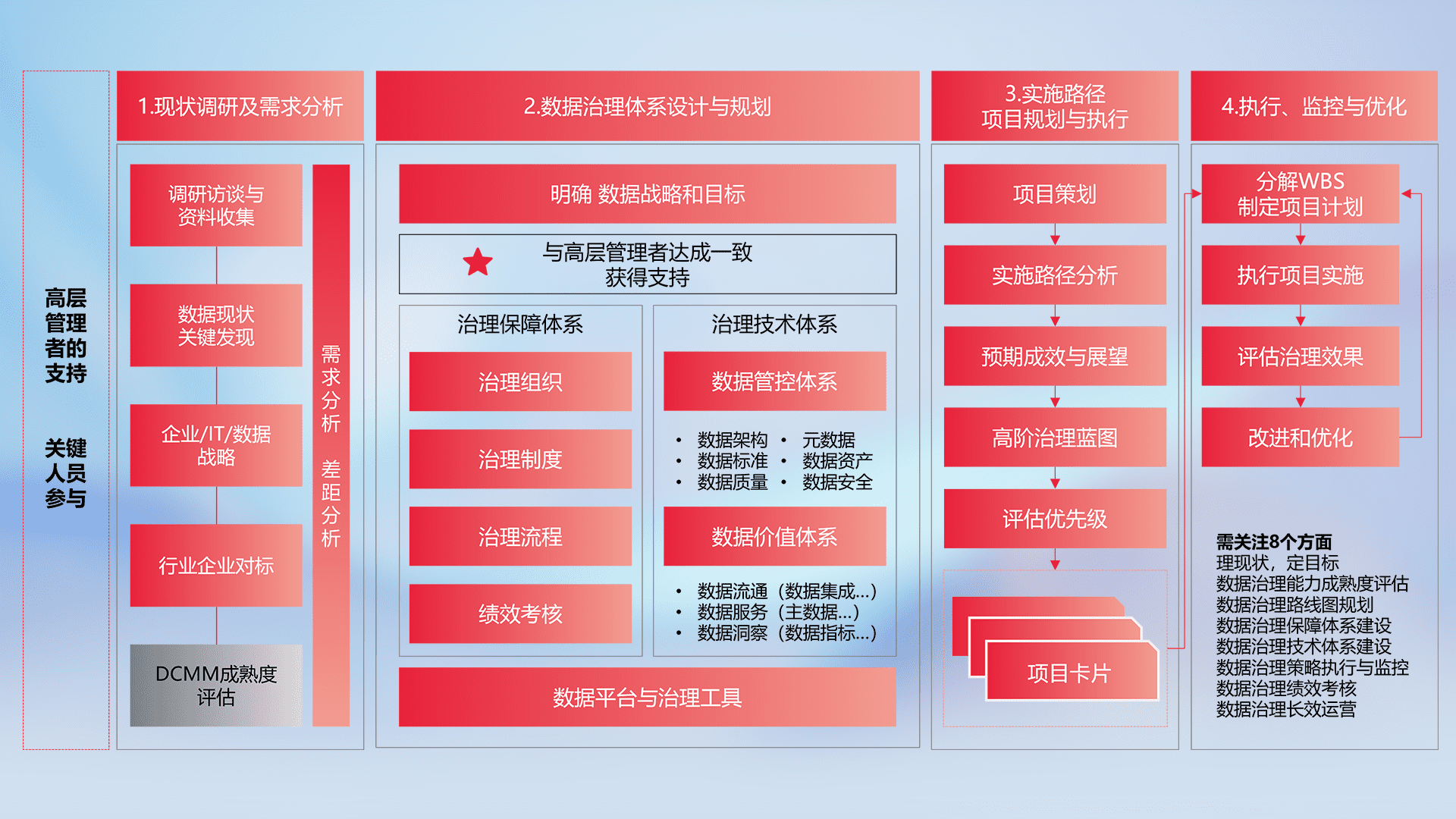 制定并执行统一的数据标准,,,,规范数据定义和格式,,消除冗余和不一致性,,,实现跨部门和跨系统的数据一致性,,,,为企业提供标准化的数据基础。。